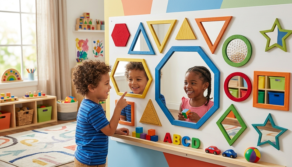 Toddlers are famously narcissistic in the cutest way possible. They love looking at themselves. When I was raising my three, I realized that a floor-length mirror was okay, but a “reflection gallery” was better. I used acrylic safety mirrors—never real glass—and cut them into different shapes like circles, triangles, and squares. I mounted them at different heights so that as the kids grew, they could see different parts of themselves.