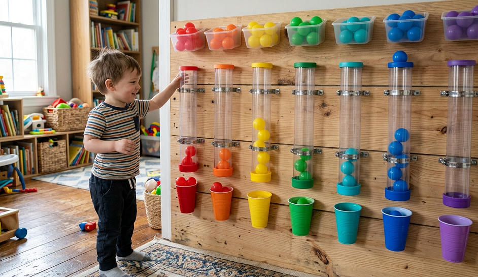 This is the project that kept Leo occupied for forty-five minutes straight—which, in toddler years, is basically a decade. You take PVC pipes or even just sturdy cardboard mailing tubes and mount them at different angles on the wall. The goal is for the child to drop a pom-pom or a ping-pong ball at the top and watch it travel through the “maze” to a basket at the bottom. I’ve seen people use paper towel rolls, but honestly, those are too flimsy. They crush the second a toddler leans on them.