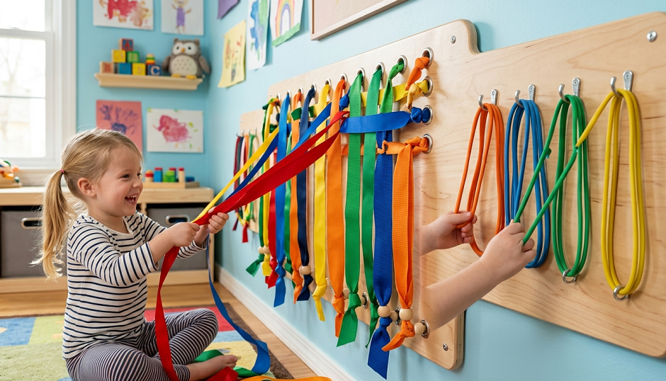 I have discovered that you must be very careful with the length of the ribbons. If they are too long, they can become a strangulation hazard. I keep every ribbon under six inches in length. Safety is paramount, and it’s better to have a shorter “tug” than a dangerous cord. I also make sure the knots on the back are double-knotted and reinforced with a bit of glue so they don’t slip through the pegboard holes.