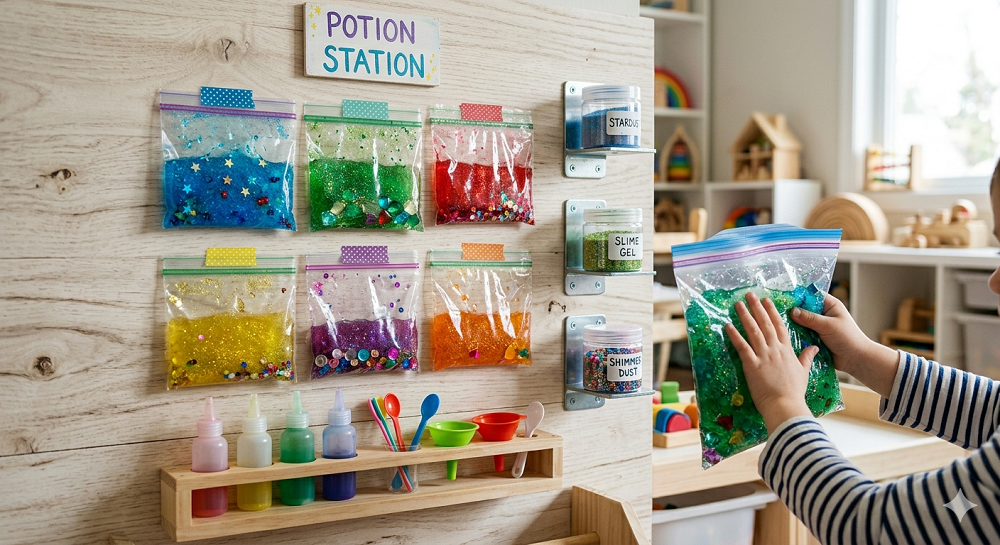 I love the idea of messy play, but I don’t always love the reality of mopping my floors for the third time in a day. The squishy bag wall is the “clean” version of a potion station. You take heavy-duty freezer bags, fill them with hair gel, food coloring, and some glitter or small flat charms, and tape them securely to the wall. I’ve found that using painters’ tape is a waste of time; you need high-quality duct tape or even a wooden frame to hold the edges down.