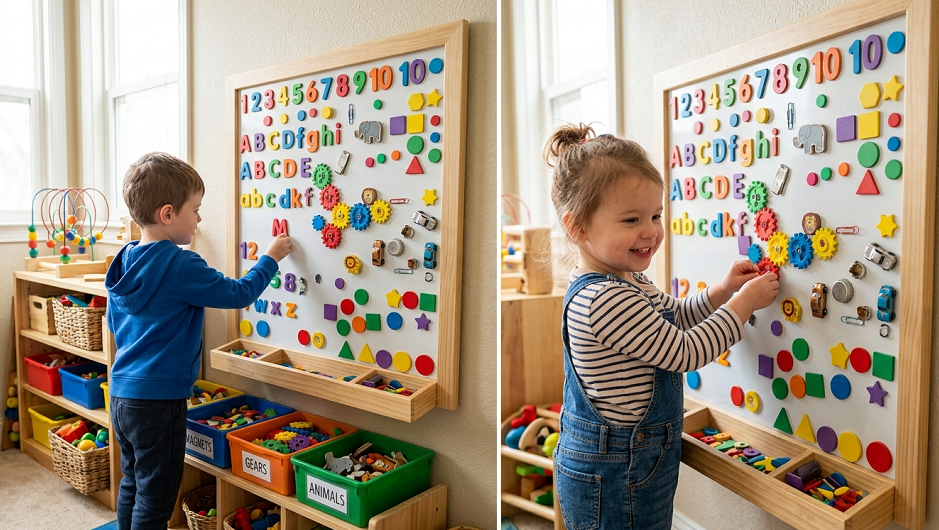 Avoid the cheap “refrigerator” magnets that have the tiny circular magnets glued on the back. Those can pop off, and they are incredibly dangerous if swallowed. Always use full magnetic sheets or very large, integrated magnetic toys. Safety is the one area where I’m not “gentle”—I’m firm. If it can fit through a toilet paper roll, it doesn’t go on the sensory wall. My kids spent years at this station, eventually transitioning from family photos to magnetic gear sets and complex marble runs.