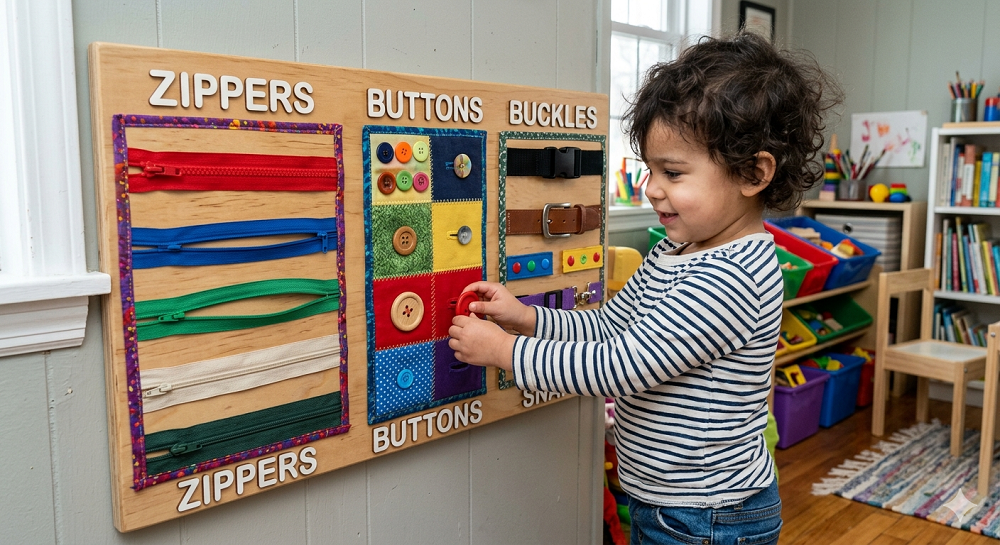 As a mother of three, I can tell you that the most frustrating part of the morning is trying to get a toddler into a car seat or a jacket when they decide they “want to do it myself” but don’t actually know how. I built a sensory wall section dedicated to the mechanics of dressing. I used old pairs of jeans and jackets, cut out the functional parts (the fly, the pocket with a button, the sleeve with a cuff), and mounted them to the wall.
